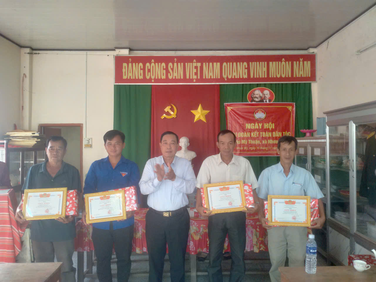 Tại ấp Mỹ Thuận, ngày hội diễn ra vào chiều 15/11 với sự tham dự của đồng chí Nguyễn Văn Sanh – Ủy viên Thường vụ Đảng ủy, Chủ tịch Ủy ban MTTQ Việt Nam xã Nhơn Mỹ. Phát huy truyền thống 95 năm của Mặt trận Dân tộc thống nhất Việt Nam, trong năm 2025, ấp đã triển khai nhiều phong trào thi đua sôi nổi, vận động Nhân dân tham gia xây dựng cầu, làm đường, tặng quà, khám chữa bệnh… với tổng kinh phí hơn 720 triệu đồng. Toàn ấp hiện có 700 hộ gia đình văn hóa, đạt 90,43%. Dịp này, UBND xã tặng 08 giấy khen cho các gia đình văn hóa tiêu biểu.