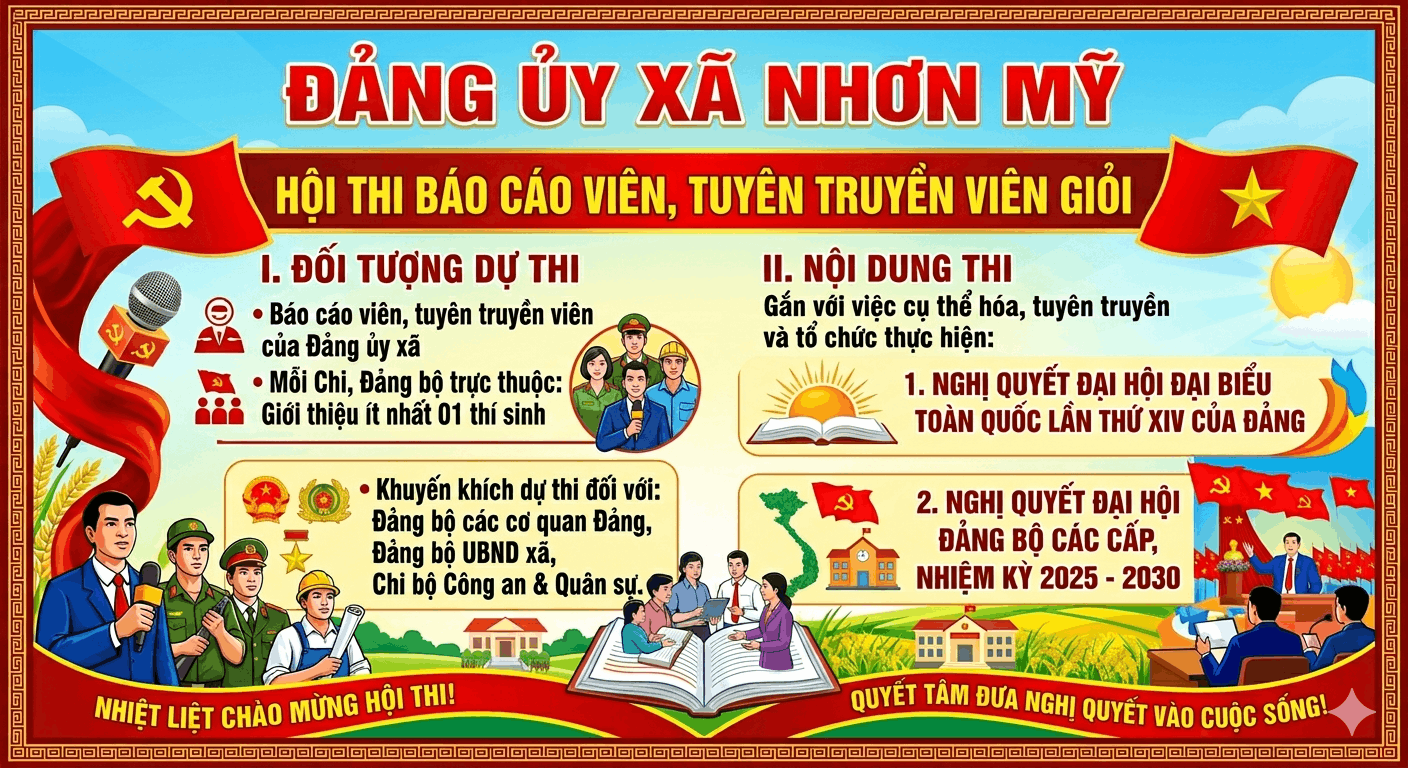 Đảng ủy xã Nhơn Mỹ vừa xây dựng Kế hoạch 48, ngày 01/04/2026 về việc tổ chức Hội thi báo cáo viên, tuyên truyền viên giỏi năm 2026 về Nghị quyết Đại hội XIV của Đảng và Nghị quyết Đại hội Đảng bộ các cấp, nhiệm kỳ 2025 – 2030.