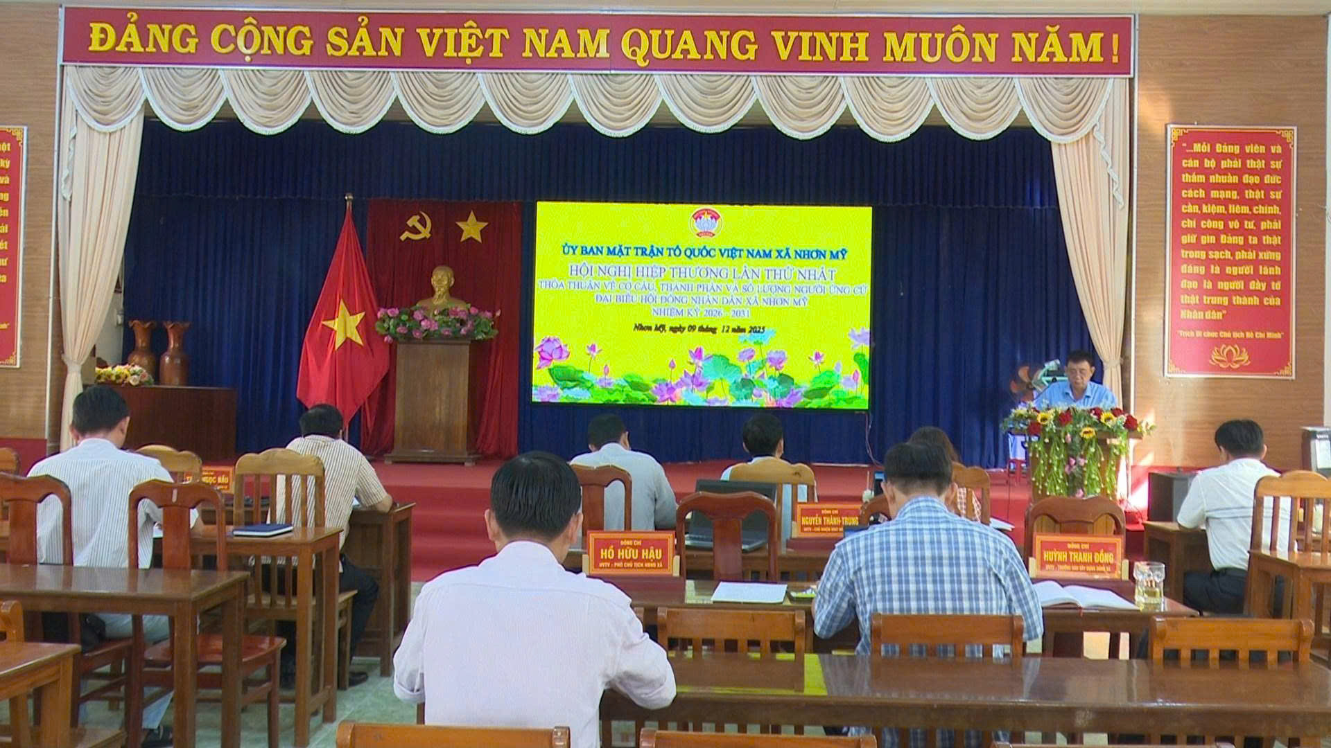 Chiều ngày 09/12/2025, Ban Thường trực Ủy ban Mặt trận Tổ quốc Việt Nam xã Nhơn Mỹ phối hợp với Thường trực HĐND xã tổ chức Hội nghị hiệp thương lần thứ nhất thỏa thuận về cơ cấu, thành phần, số lượng người được giới thiệu ứng cử đại biểu HĐND xã, nhiệm kỳ 2026 - 2031. Tham dự Hội nghị có các đồng chí Trần Ngọc Bầu - Bí thư Đảng uỷ, Chủ tịch HĐND xã; đồng chí Quang lê Hồng Chuyên - Phó bí thư Thường trực Đảng ủy xã; đồng chí Nguyễn Hoàng Tuấn, Phó Bí thư Đảng ủy, Chủ tịch UBND xã; đồng chí Nguyễn Văn Sanh, Ủy viên Ban Thường vụ Đảng ủy, Chủ tịch Ủy ban MTTQ xã chủ trì hội nghị.