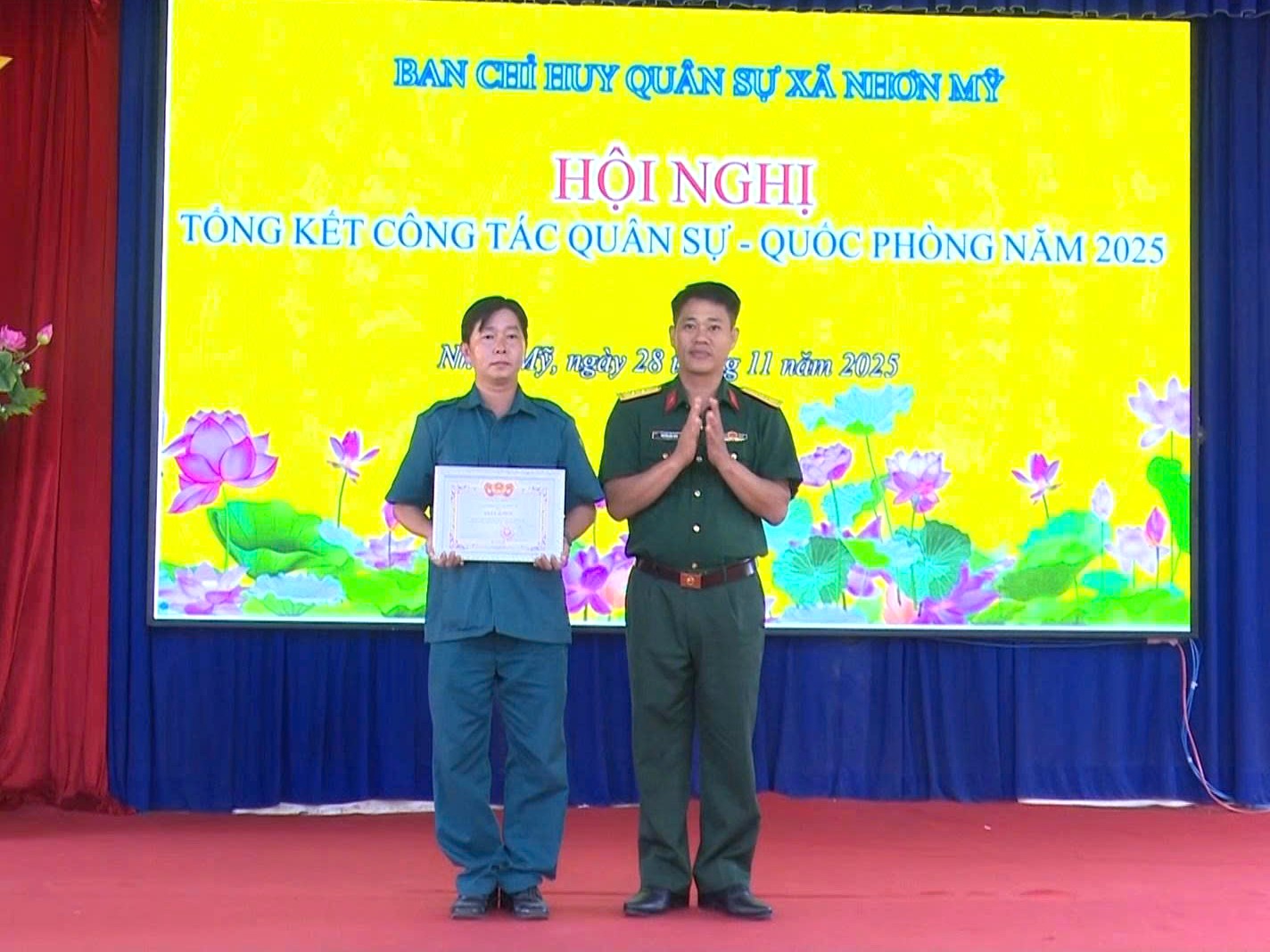 Chiều ngày 28/11/2025, Ban Chỉ huy Quân sự xã Nhơn Mỹ tổ chức Hội nghị tổng kết công tác quân sự, quốc phòng địa phương năm 2025. Đến dự có Trung tá Nguyễn Bảo Thảo, Chủ nhiệm Hậu cần – Kỹ thuật, Ban Chỉ huy Phòng thủ khu vực 1 - Long Phú; đồng chí Trần Ngọc Bầu, Bí thư Đảng ủy, Chủ tịch Hội đồng nhân dân xã; đồng chí Nguyễn Hoàng Tuấn, Phó Bí thư Đảng ủy, Chủ tịch Ủy ban nhân dân xã.