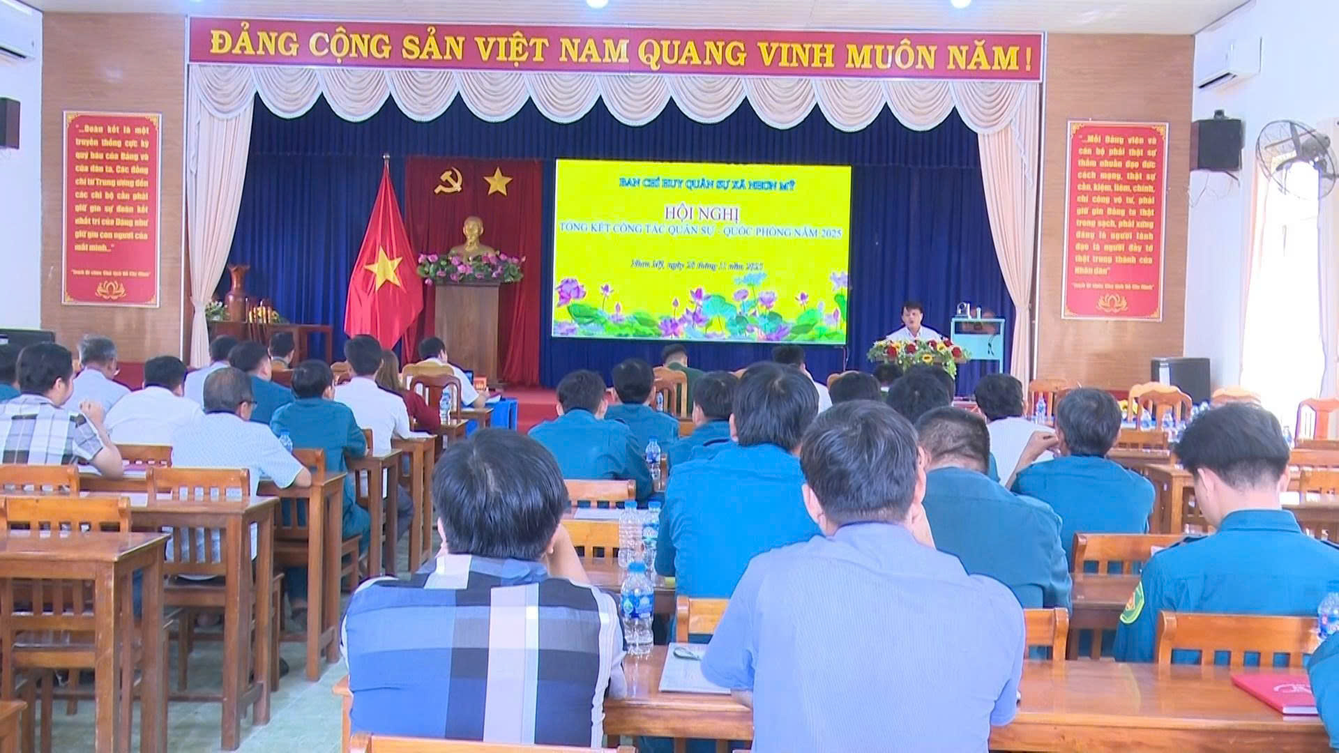 Phát biểu kết luận hội nghị, đồng chí Nguyễn Hoàng Tuấn, Phó Bí thư Đảng ủy, Chủ tịch Ủy ban nhân dân xã ghi nhận và biểu dương những kết quả mà Ban Chỉ huy Quân sự xã cùng các lực lượng đã đạt được trong năm 2025, đặc biệt là việc duy trì nghiêm chế độ trực sẵn sàng chiến đấu, hoàn thành chỉ tiêu giao quân, giữ vững an ninh chính trị, trật tự an toàn xã hội trên địa bàn. Trong thời gian tới, công tác quốc phòng, quân sự địa phương cần tiếp tục được tăng cường, phát huy vai trò nòng cốt của lực lượng dân quân tự vệ, nâng cao chất lượng huấn luyện, sẵn sàng ứng phó với mọi tình huống; đồng thời làm tốt công tác phối hợp giữa lực lượng quân sự, công an và các ban, ngành, đoàn thể, xây dựng nền quốc phòng toàn dân gắn với thế trận an ninh nhân dân vững chắc.