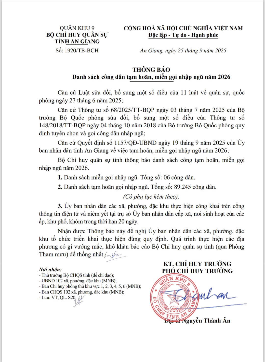 Căn cứ Quyết định số 1157/QĐ-UBND ngày 19 tháng 9 năm 2025 của Ủy ban nhân dân tỉnh An Giang về việc tạm hoãn, miễn gọi nhập ngũ năm 2026;