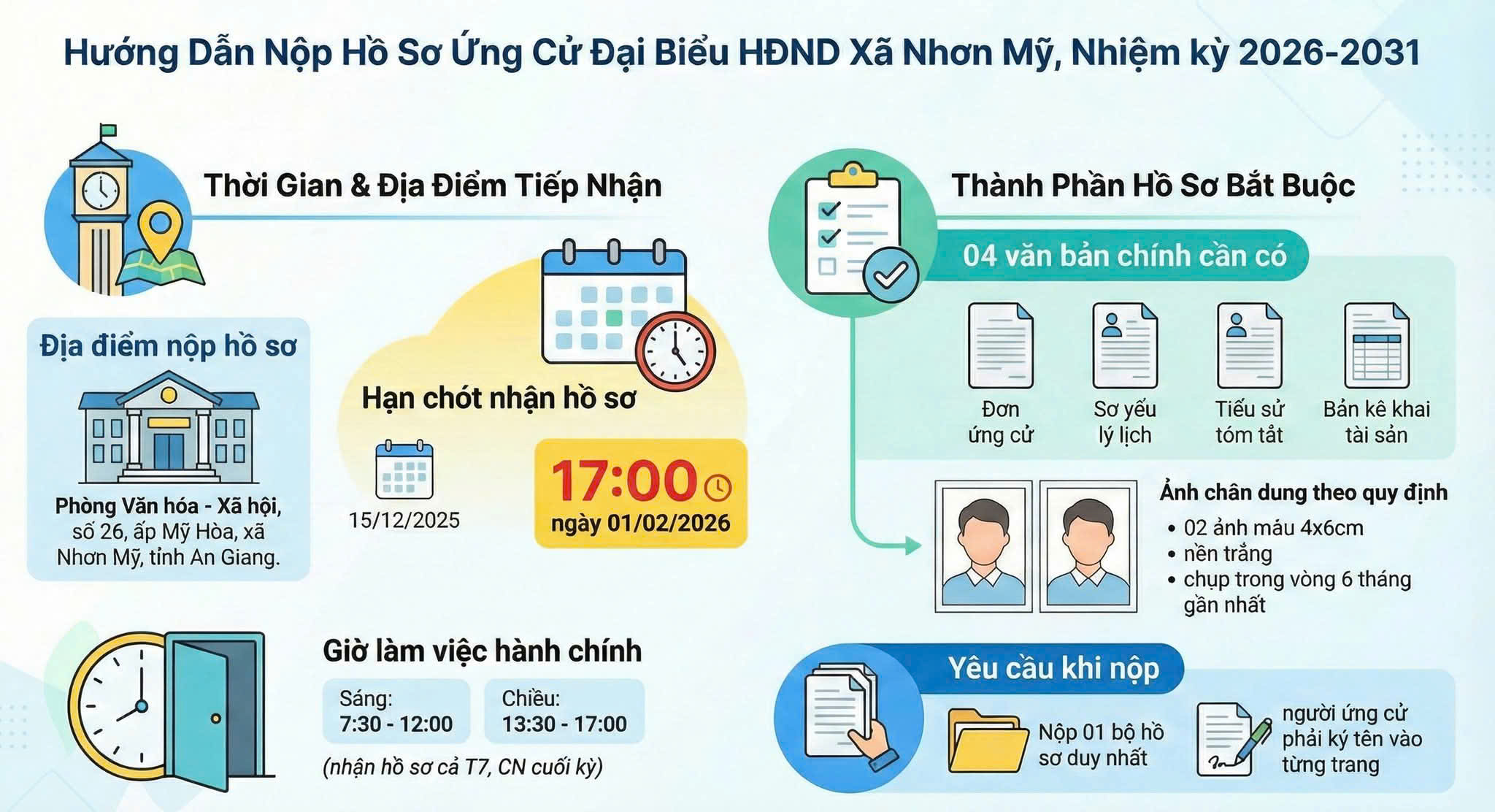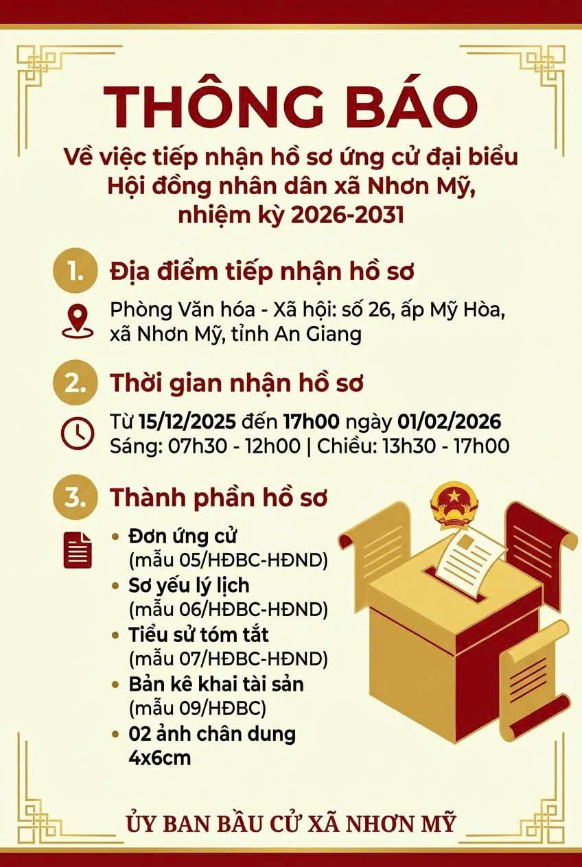 Căn cứ Luật Bầu cử đại biểu Quốc hội và đại biểu Hội đồng nhân dân năm 2015 (sửa đổi, bổ sung năm 2025); Nghị quyết số 40, ngày 29/9/2025 của Hội đồng bầu cử Quốc gia quy định mẫu văn bản hồ sơ ứng cử và việc nộp hồ sơ ứng cử; nội quy phòng bỏ phiếu trong công tác bầu cử đại biểu Quốc hội, khóa XVI và đại biểu Hội đồng nhân dân các cấp, nhiệm kỳ 2026 - 2031. Ủy ban bầu cử xã Nhơn Mỹ thông báo địa điểm; thời gian và một số nội dung liên quan đến việc tiếp nhận hồ sơ ứng cử đại biểu Hội đồng nhân dân xã nhiệm kỳ 2026 - 2031 như sau: