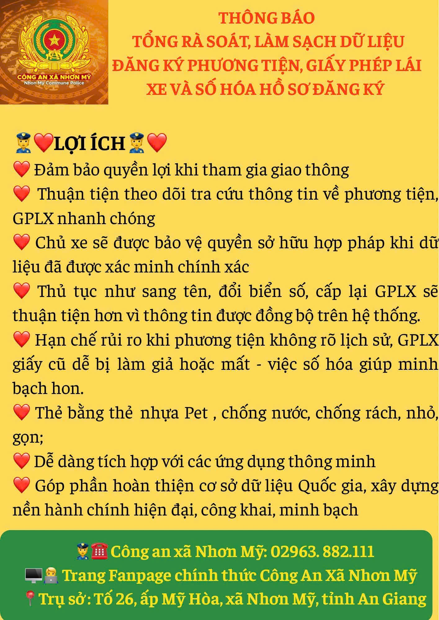 Thời gian thực hiện rà soát bắt đầu từ ngày 21 tháng 10 năm 2025 đến hết ngày 15 tháng 12 năm 2025. Đối tượng rà soát là tất cả các loại phương tiện gồm: Xe ô tô, xe mô tô, xe gắn máy, xe máy điện và các loại Giấy phép lái xe của công dân hiện đang cư trú hoặc tạm trú trên địa bàn xã Nhơn Mỹ.