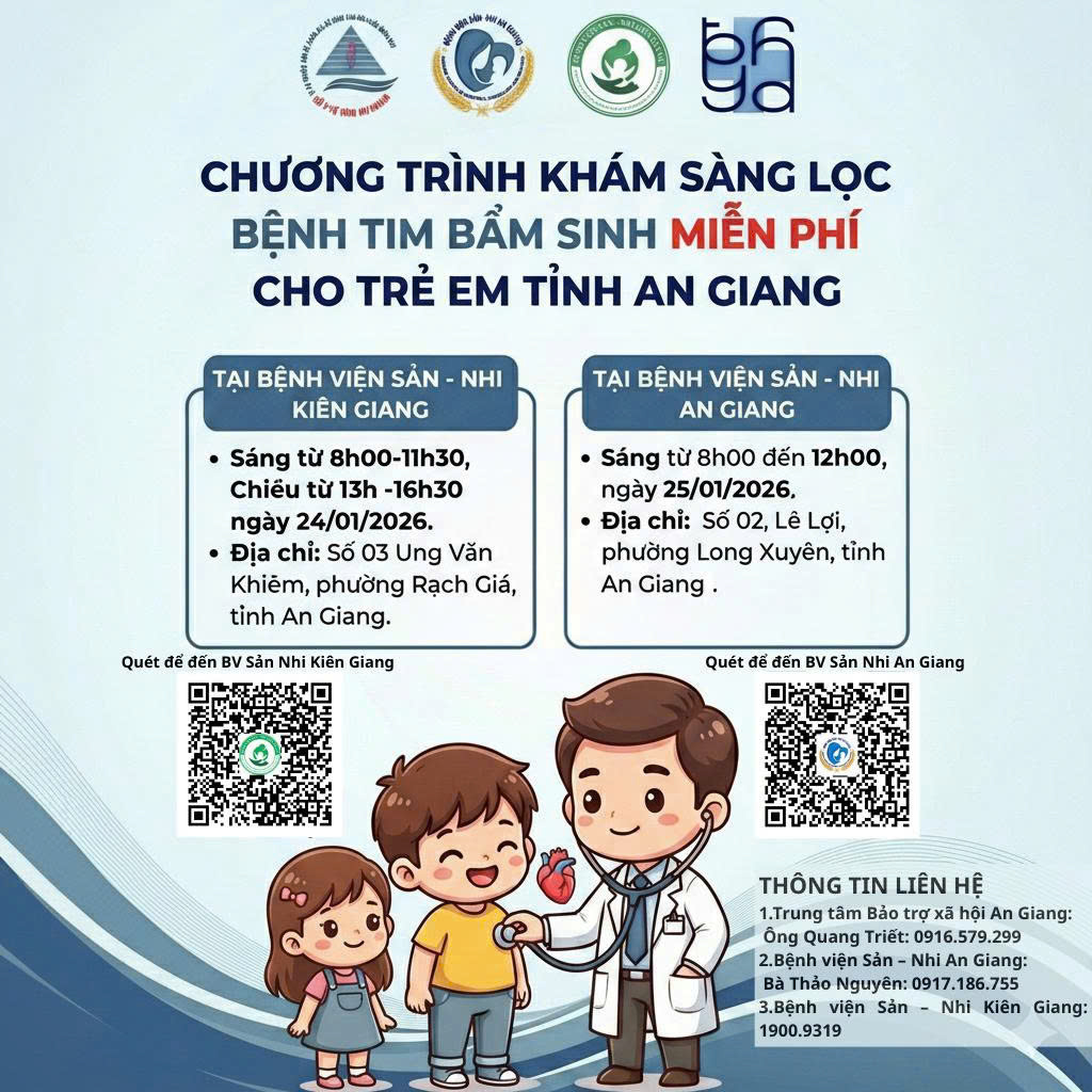 Bà Trần Thu Hằng – Phó Giám Đốc Trung tâm Bảo trợ xã hội An Giang đã kí, ban hành Công văn số 63, ngày 19/1/2026, về việc khám, sàng lọc bệnh tim bẩm sinh miễn phí cho trẻ em tại tỉnh An Giang. Theo đó, đối tượng được khám miễn phí là Trẻ em và người dưới 18 tuổi trên địa bàn tỉnh An Giang có biểu hiện nghi ngờ bệnh tim bẩm sinh.