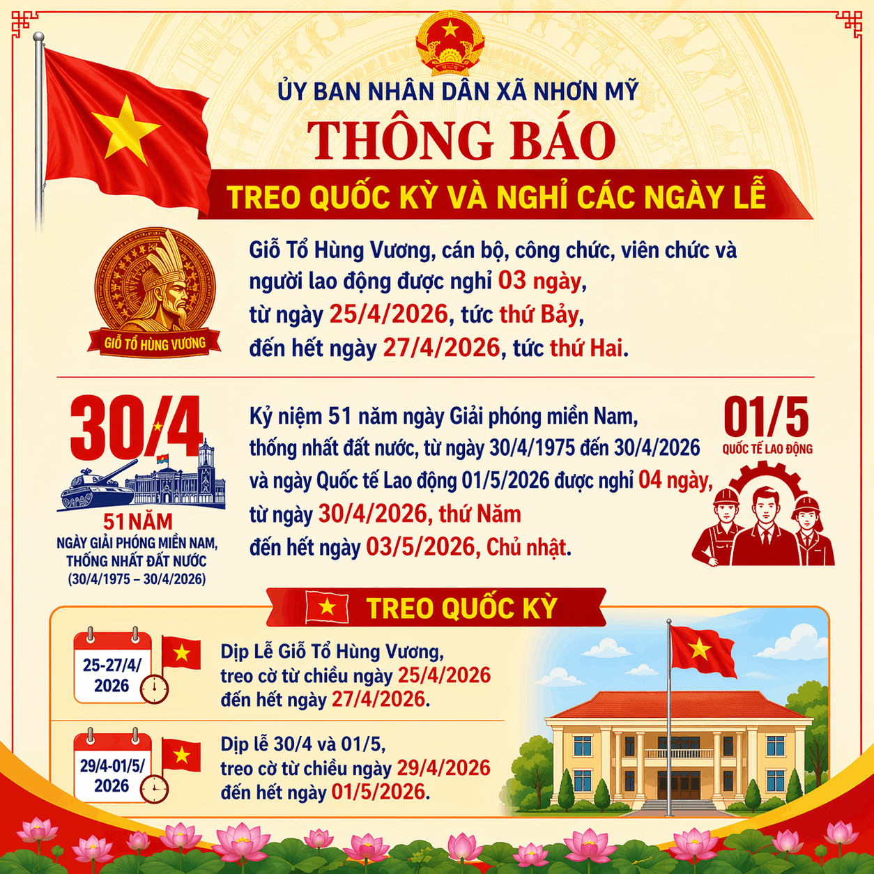 UBND xã Nhơn Mỹ thông báo treo Quốc kỳ - nghỉ Giỗ Tổ Hùng Vương và Lễ 30/4-1/5